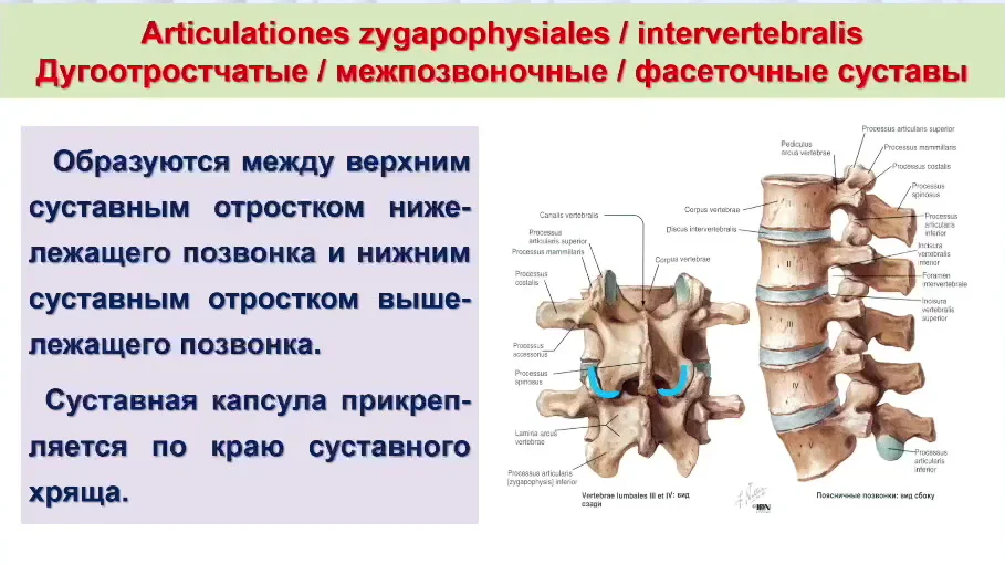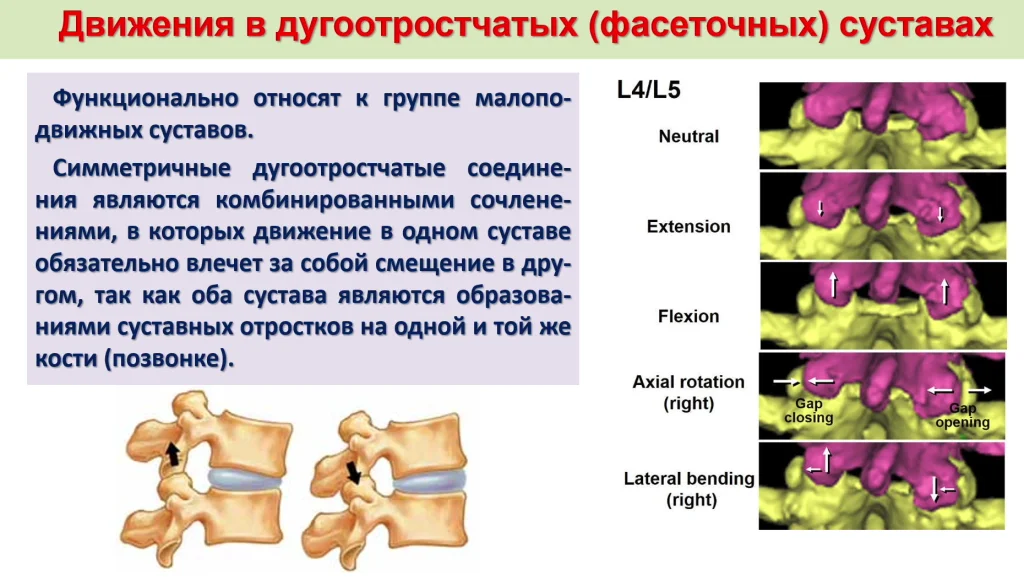 Это одна система: каждый позвонок участвует в формировании четырех дугоотросчатых суставов: два сверху, два снизу. И движения во всех этих суставах комбинированные, поскольку движется тело позвонка с отростками, и движение так или иначе во всех четырёх суставах, в которых участвует позвонок.