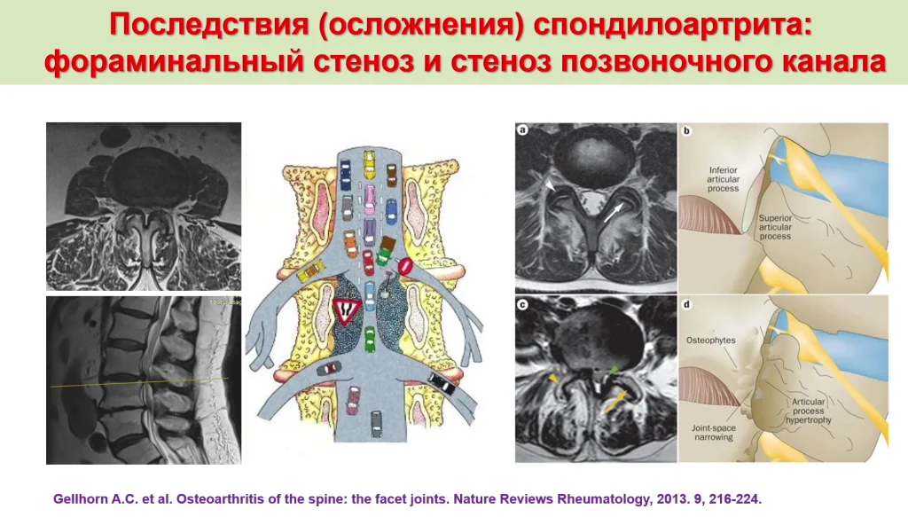 Развитие остеоартрита фасеточных суставов содержит те же четыре стадии, что и в классификации Лоуренса при остеоартритах.