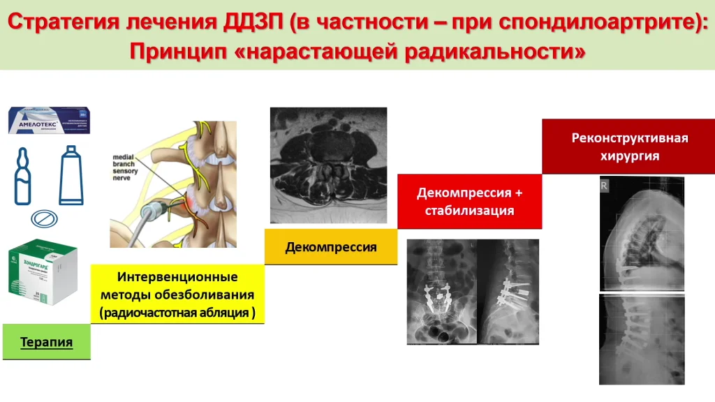 Лечение дегенеративно-дистрофических заболеваний позвоночника в целом и, в частности, спондилоартроза, остеоартритов фасеточных суставов ведется по принципу “нарастающей радикальности”.