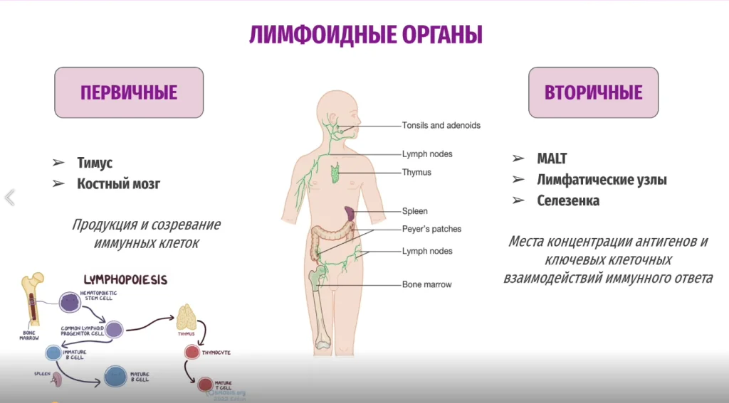 Иммунная система состоит из органов, тканей, клеток и молекул. Иммунные органы делятся на: