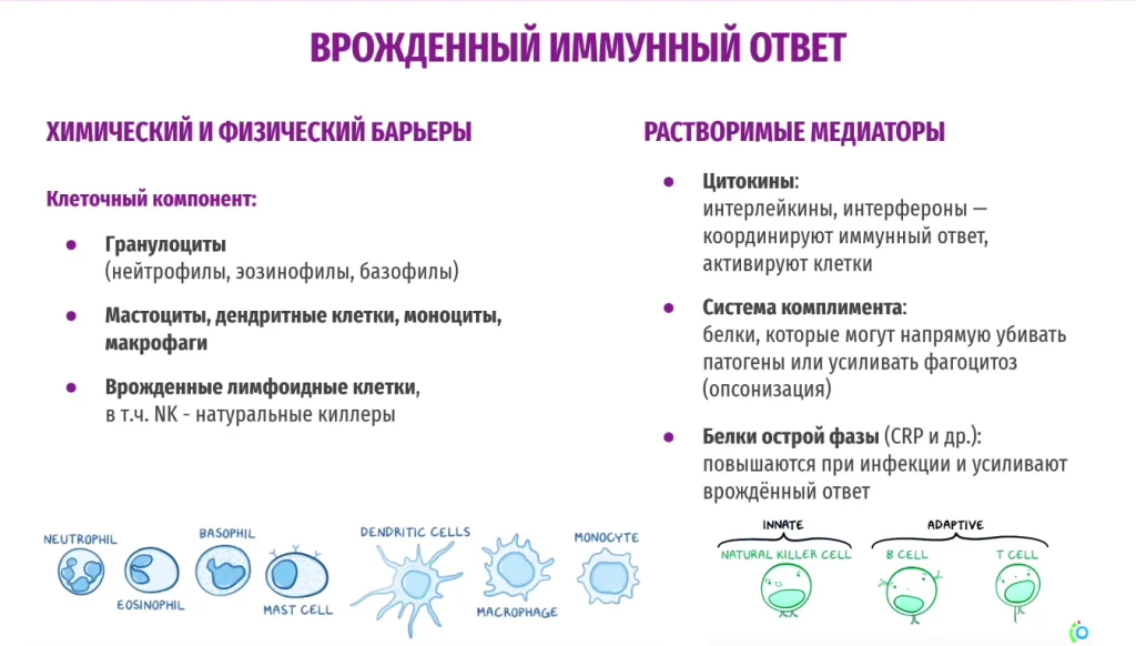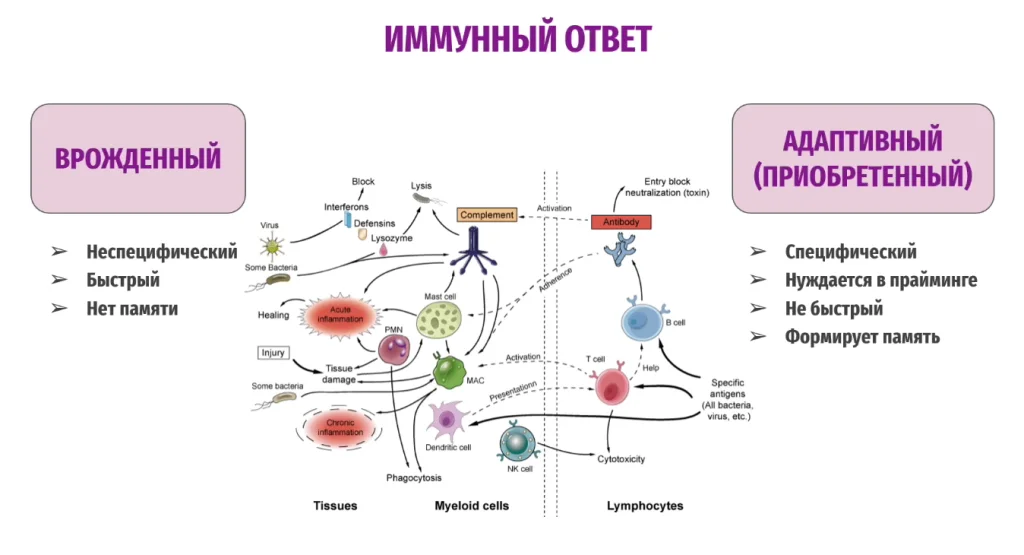 Клетки врожденного иммунного ответа являются неспецифическими - они не умеют отличать один патоген от другого. Врожденный иммунитет развивается быстро, в течение нескольких минут и часов и не формирует память.