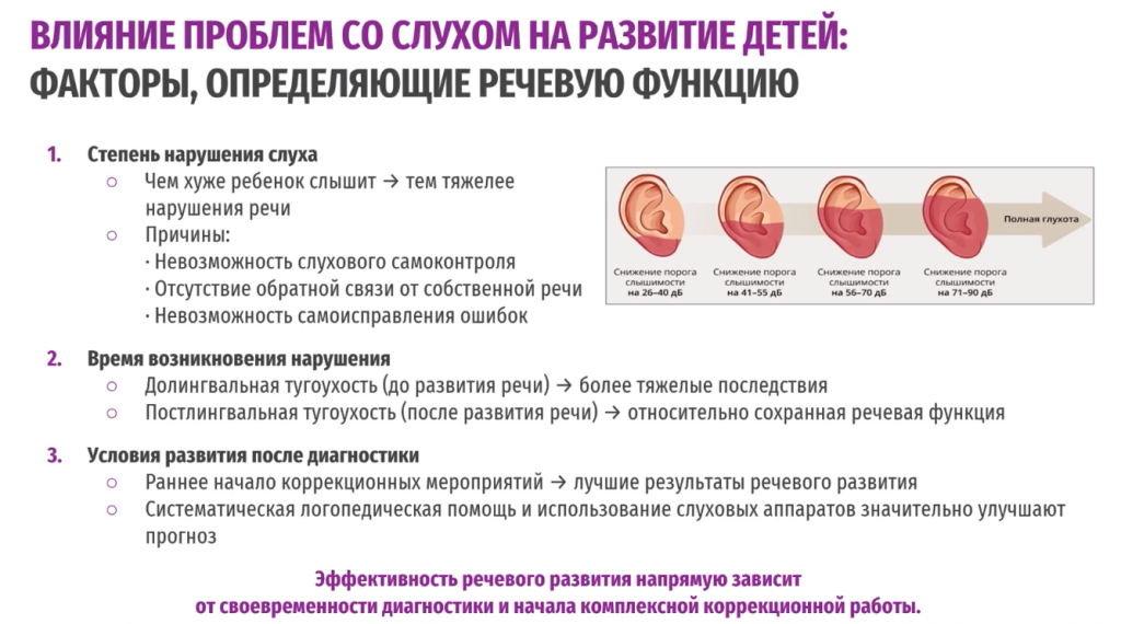 У детей, у которых снизился слух/оглохли уже после формирования речи, как правило, при должной активной работе речь не страдает. При этом, если такой работы нет, то к школьному возрасту эти дети утрачивают полностью речевую функцию.