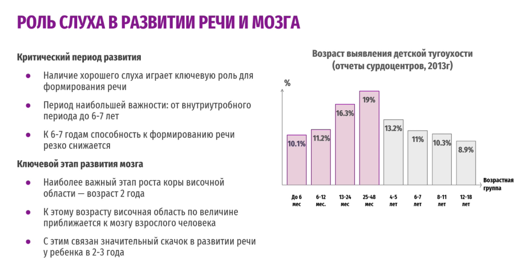 Средний возраст обнаружения нарушения слуха - около года, максимум - два года. И, как правило, зона речевого развития закладывается 2−3 года, и примерно к 5−7 годам постепенно пластичность в этой зоне уменьшается. Поэтому критически важно добиться того, чтобы ребенок в итоге пошел в обычную массовую школу.