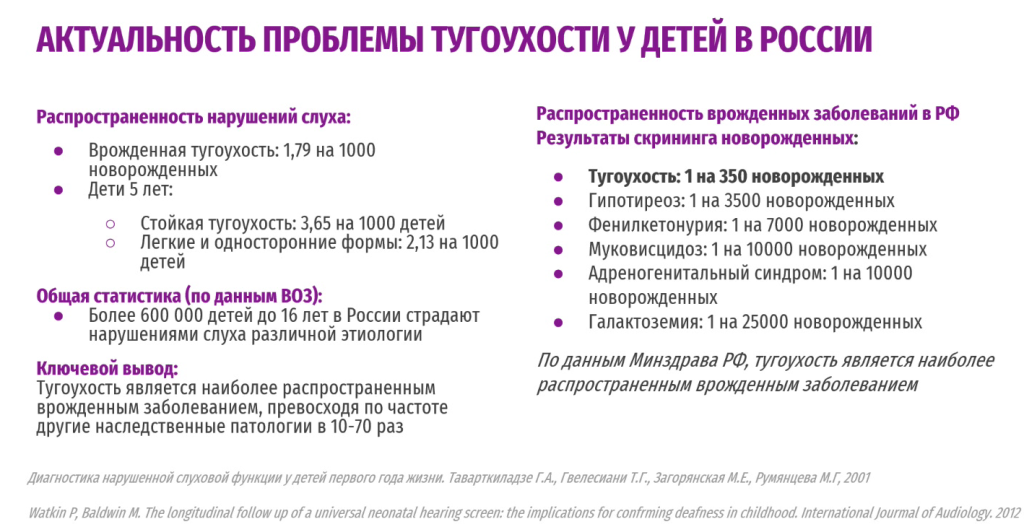 По данным статистики детских сурдоцентров, врожденная тугоухость встречается примерно около 1−2 на тысячу новорожденных детей. При этом стоит отметить, что к возрасту 5 лет количество удваивается.