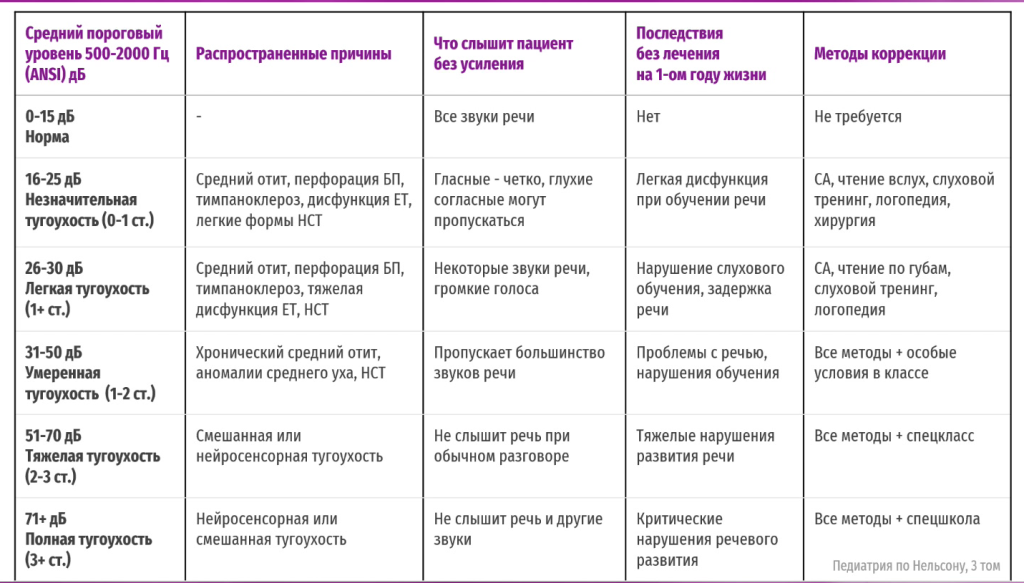 В таблице ниже представлена зависимость степени снижения слуха и тех изменений, которые возникнут в речи в случае, если не реабилитировать ребенка.