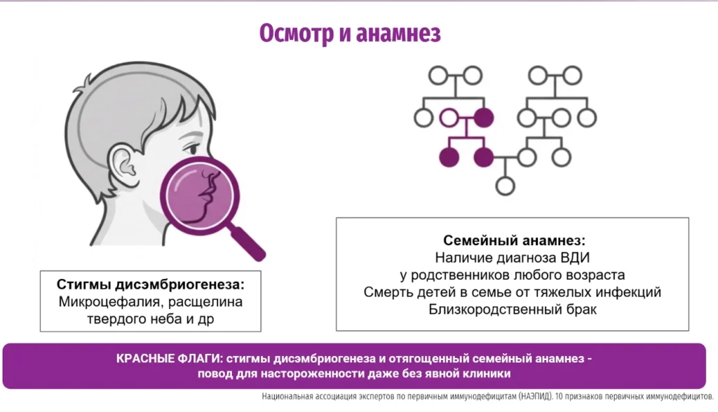 При осмотре и при анамнезе врач может увидеть такие настораживающие признаки, как, например, стигма-дисембриогенеза: микроэцефалия или расширенно твёрдого нёба — это признаки некоторой синдромальной патологии, которая тоже может быть в совокупности и может подсказать, что мы имеем дело с дефектом иммунитета.