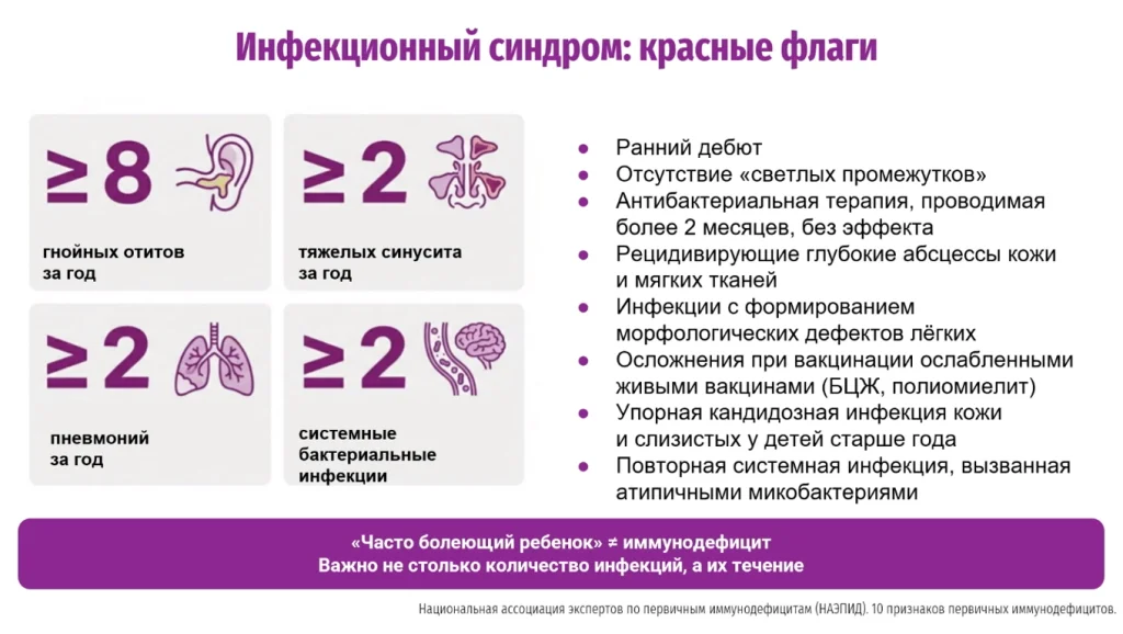 Важно не столько количество инфекций, сколько то, как они протекают. Выше на рисунке представлены настораживающие признаки иммунодефицита.