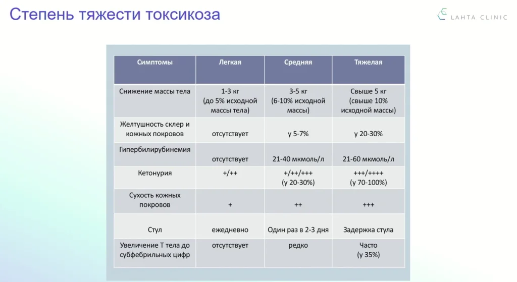 Степень тяжести токсикоза представлена в клинических рекомендациях по токсикозу первой половины беременности.