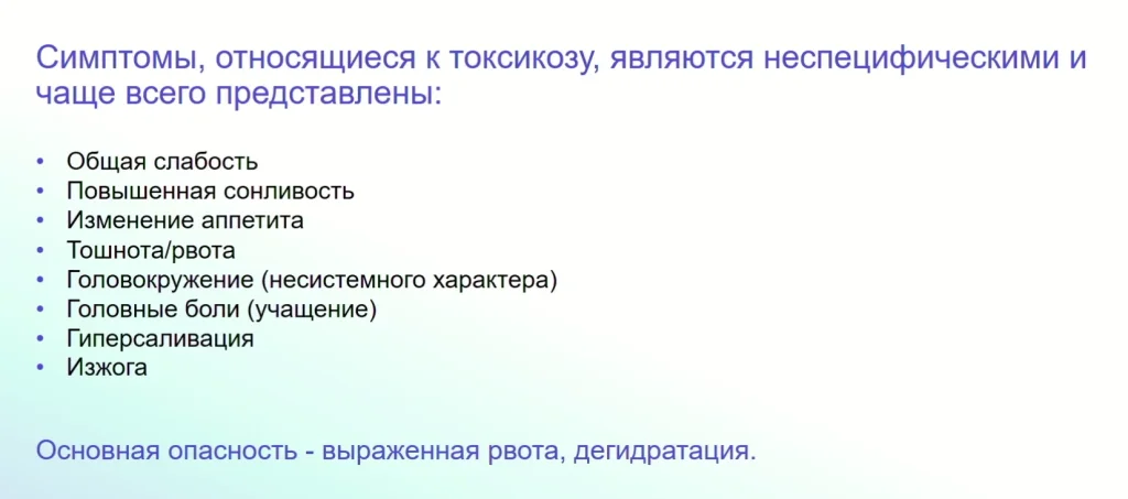 В основном это симптомы, которые проявляются с начала беременности до 12—14 недель беременности.