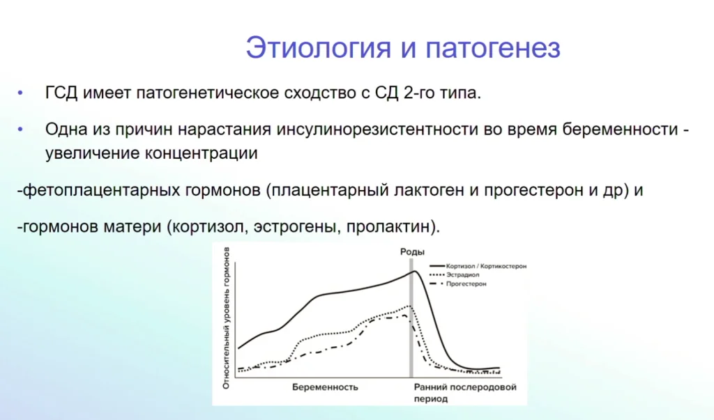 Гестационный диабет похож по своему патогенетическому развитию с диабетом второго типа. Одна из главных причин во время беременности повышения уровня глюкозы — это повышение контринсулярных гормонов.