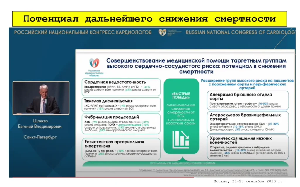 Эксперт ссылается на мнение руководителей, академика Евгения Владимировича Шляхто, который на кардиологическом конгрессе 2023 года представил потенциал дальнейшего снижения смертности.