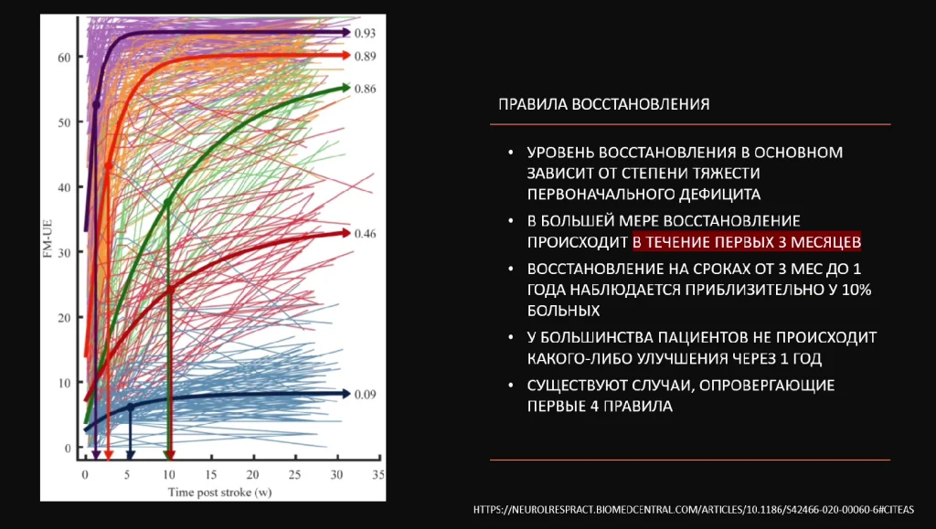 Патофизиологические изменения, которые происходят в организме после острой ишемии мозга указывают на то, что уровень максимального восстановления наблюдается в течение первых трех месяцев, когда можно получить очень хорошие клинические результаты по исходам.