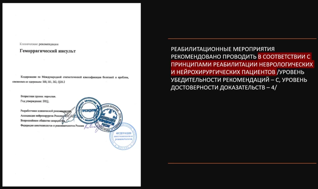 Коллеги-нейрохирурги не отстают в этом и в рекомендациях по геморрагическому инсульту они также указывают на необходимость ранней реабилитационной интервенции в соответствии с принципами оказания помощи больным с неврологическим и нейрохирургическим профилем.