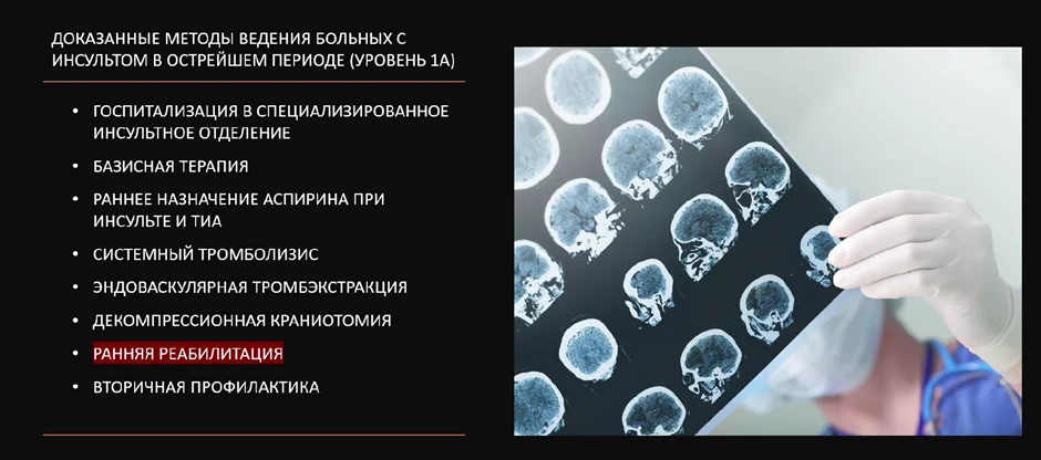 Но если использование тромболизиса всё-таки имеет некоторые ограничения в связи с необходимостью использования его в очень ограниченный период времени после инсульта, то ранняя реабилитация открывает очень широкие возможности для восстановления пациентов.