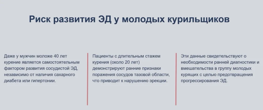 Пациенты со стажем курения более 20 лет, демонстрируют ранние признаки нарушения сосудистой системы в тазовой области, что также приводит к проблемам с эрекцией.