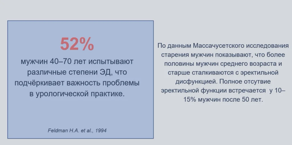 Проводилось достаточно масштабное массачусотское исследование, изучающее старение мужчин, которое показывало, что больше половины мужчин среднего возраста сталкиваются с эректильной дисфункцией той или иной степени. Полное отсутствие эрекции встречается у мужчин старше 50 лет в 10% случаев, а старше 60 лет- более 15%.