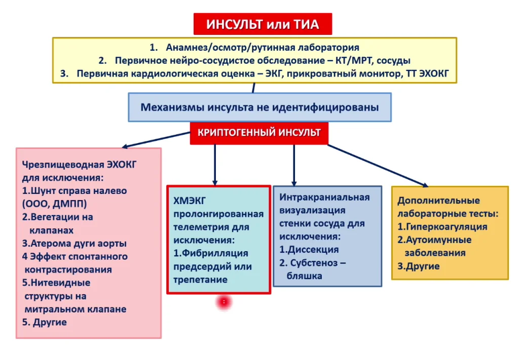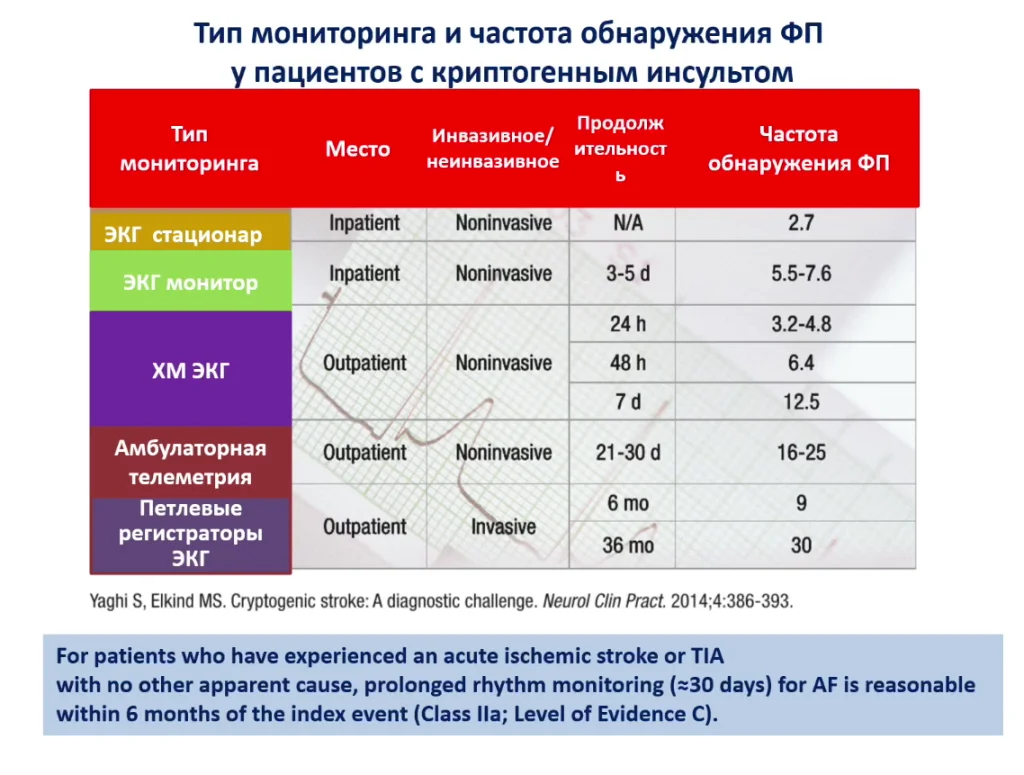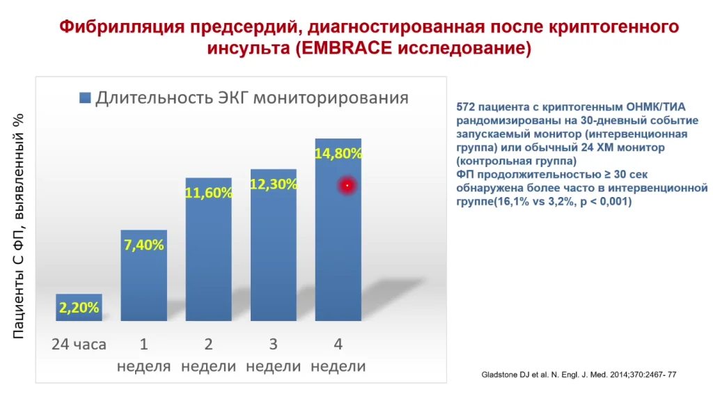 Работы 10-летней давности говорили, что при криптогенном инсульте можно поставить петли-регистраторы ЭКГ, и через 4 недели 15% демонстрируют фибрилляцию предсердия - причина инсульта.
