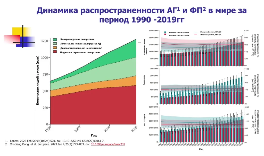 Распространенность артериальной гипертензии растет с 1990 по 2019 год. На рисунке выше слева представлена распространенность АГ, а справа - фибрилляции предсердий. Видно, что распространенность ФП значительно быстрее и увеличивается, чем АГ.
