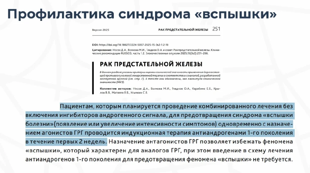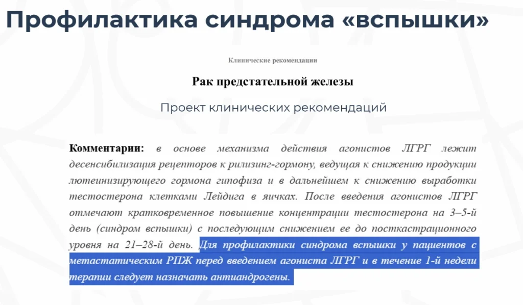В части анти-андрогенов в рекомендациях Минздрава России по раку предстательной железы написано, что для профилактики синдрома вспышки у пациентов с метастатическим раком предстательной железы перед введением агониста ГНРГ и в течение одной недели следует принимать антиандрогены первого поколения.