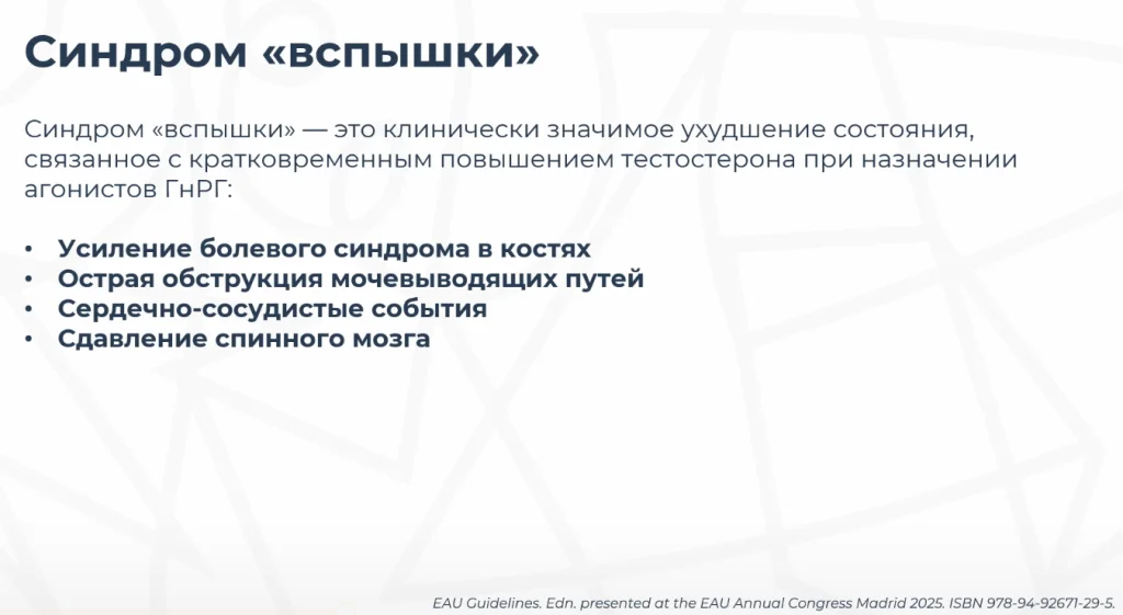 Это клиническое, значимое ухудшение состояния, которое связано с кратковременным повышением тестостерона. После первой инъекции агониста ГНРГ постепенное снижение происходит в течение 10-14 дней, но примерно через 3-5 дней после инъекции агониста ГНРГ происходит всплеск тестостерона.