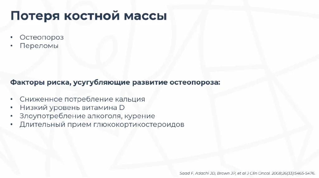 Это снижение минеральной плотности кости, которое возникает примерно через 6—9 месяцев от начала андроген-депривационной терапии.