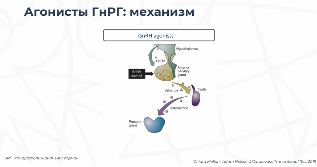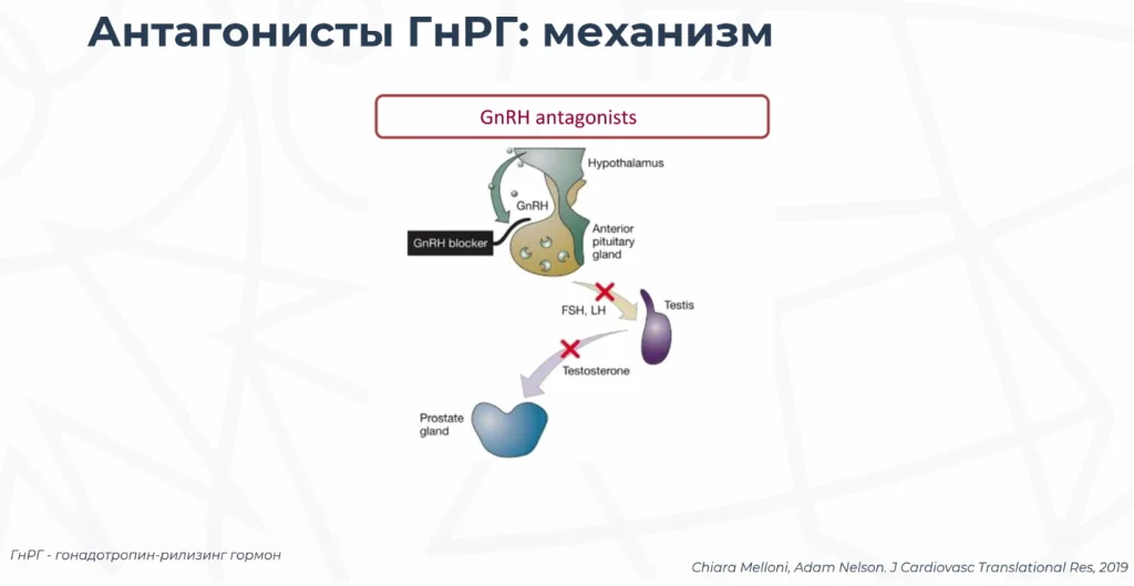 Агонисты гонадотропин-рилизинг гормона - этот спектр препаратов позволяет сначала сверхстимулировать, а затем приводит к истощению рецепторов гонадотропин-рилизинг гормона в гипофизе и впоследствии приводит к снижению тестостерона и продукции тестостерона в яичниках, в клетках ледика. Но при этом происходит кратковременное повышение тестостерона. Так называемый вот синдром “вспышки”.