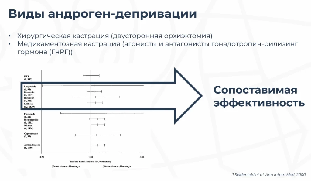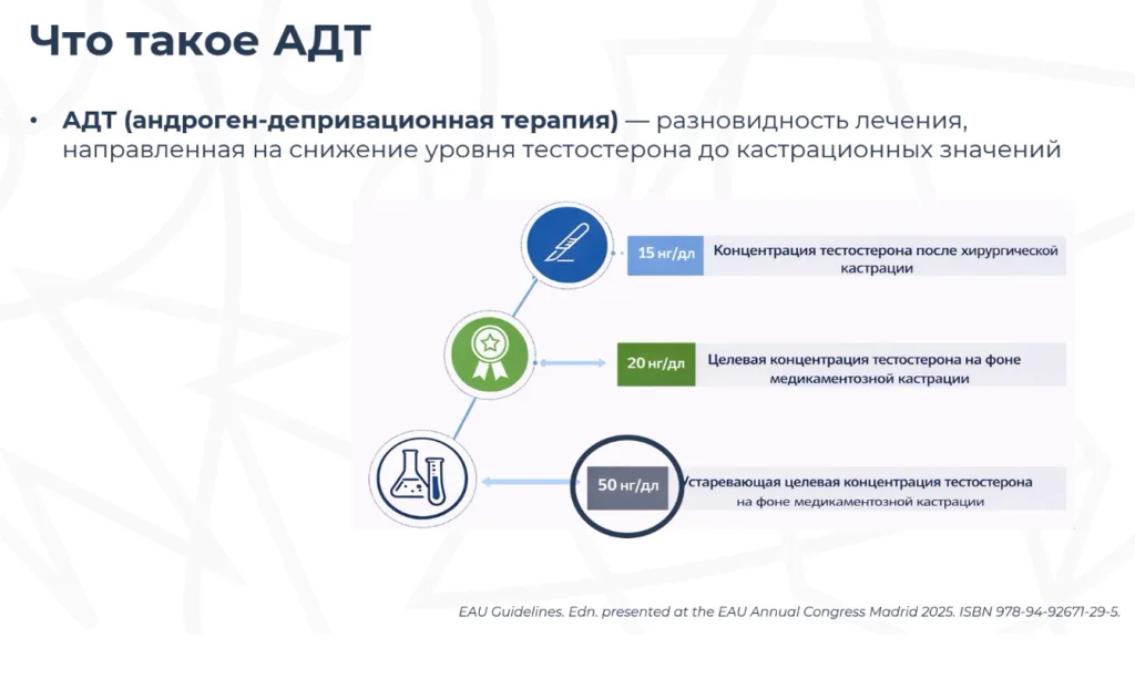 Это лечение, направленное на снижение уровня тестостерона до кастрационных значений. Кастрационный уровень тестостерона на данный момент считается значение менее 50 нанограмм на децилитр. Этот показатель установили ещё более 40 лет назад, когда тестирование на тестостерон было менее чувствительным.