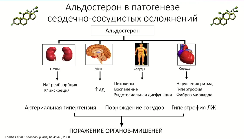 Известно, что альдостерон — это не просто некое патогенетическое звено в развитии артериальной гипертензии, но это ещё и прямой триггер поражению органов-мишеней: