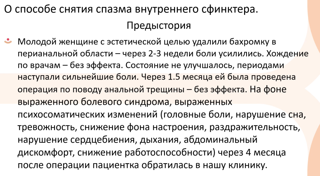 Однако через 2−3 недели у нее начинаются боли, сфинктер начинает зажиматься, она лечится около полутора месяцев, но безуспешно. Ее оперируют уже по поводу анальной трещины, и после этого ситуация снова продолжается.
