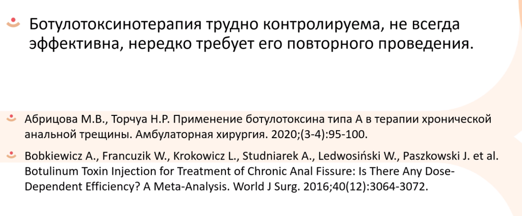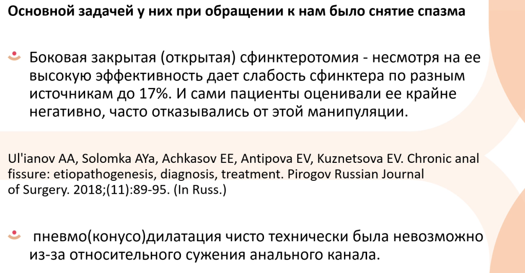 В последующем ей была проведена операция с минимальной дозой воздействия на сфинктер.