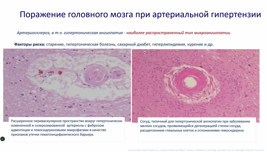 Если посмотреть, как страдают сосуды головного мозга при артериальной гипертензии, можно понять насколько многие области мозга физически не могут кровоснабжаться и страдают, поскольку такое изменение сосудов с расширением периваскулярных пространств приводит к функциональной и в дальнейшем структурной дезактивации.