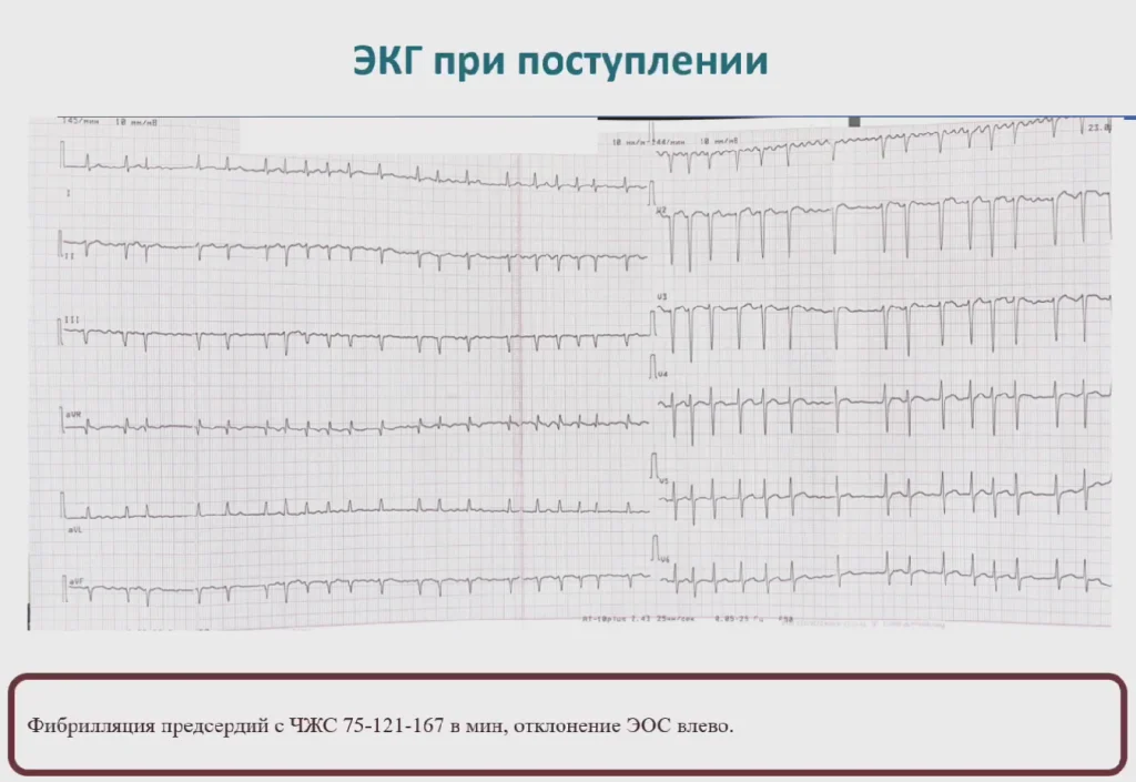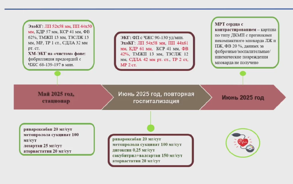 В мае после праздников 2025 года (5- 6 мая) он почувствовал сердцебиение, почувствовал одышку, головокружение и обратился в стационар по месту жительства. Врачи, увидев тахисистолию фибрилляции предсердий, сделав эхо, обратили сразу внимание, что левое предсердия 5,2 на 5,8, дилатированное. Фракция выброса при этом 62, но средняя ЧЖС 139, то есть тахисистолия.
