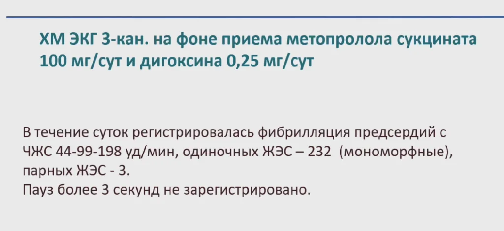 Пациент получает пульсунижающую терапию, подключаются сакубитрил с валсартаном, вся терапия по сердечной недостаточности. Ему делают суточный монитор ЭКГ и средняя ЧСС на такой терапии как бета-блокаторы дигоксин максимально достигает всего 99 ударов.