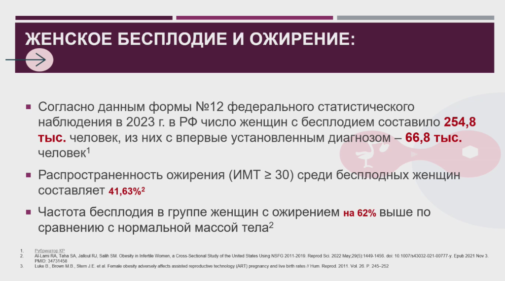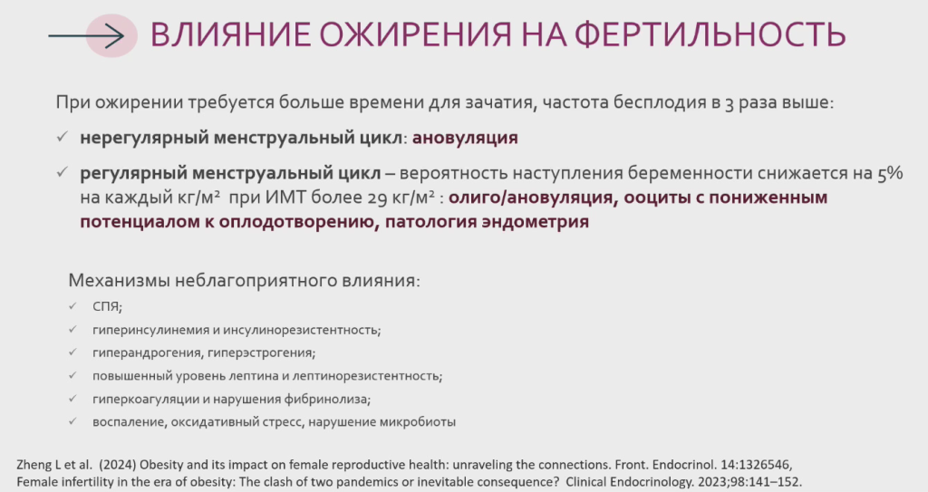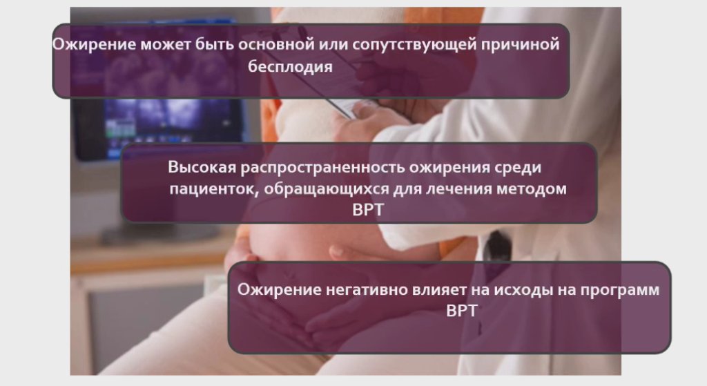 Ожирение может быть основной или сопутствующей причиной бесплодия. К эксперту приходит много пациенток с избыточной массой тела и ожирением, и в то же время постепенно накапливаются работы, что ожирение может негативно влиять на программу ВРТ.