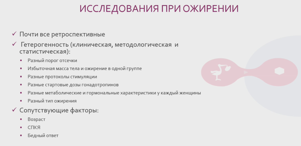 Когда в 2007 году эксперт начинала собирать материал для своей кандидатской диссертации «Особенности программ ВРТ у пациенток с избыточной массой тела и ожирением», на тот момент была практически всего одна работа, которая демонстрировала отрицательное влияние. Многие врачи говорили «да особо негативного влияния нет, мы не видим», и публикаций было мало.