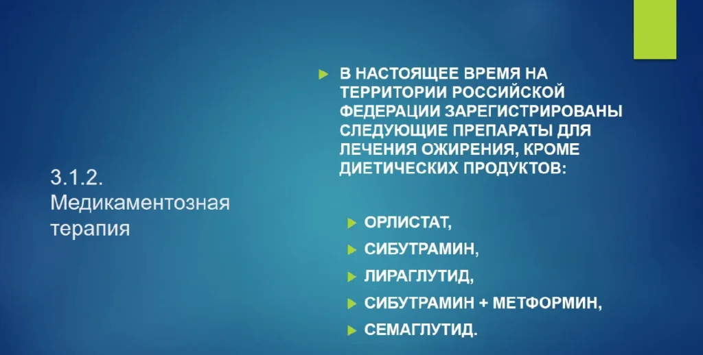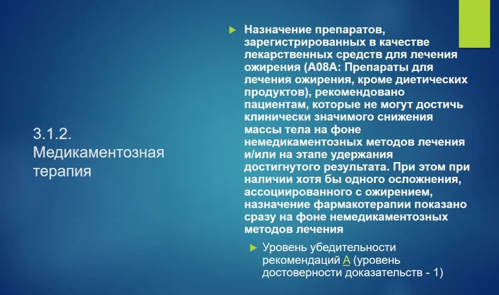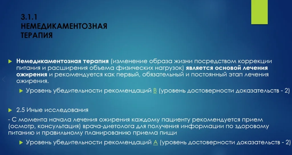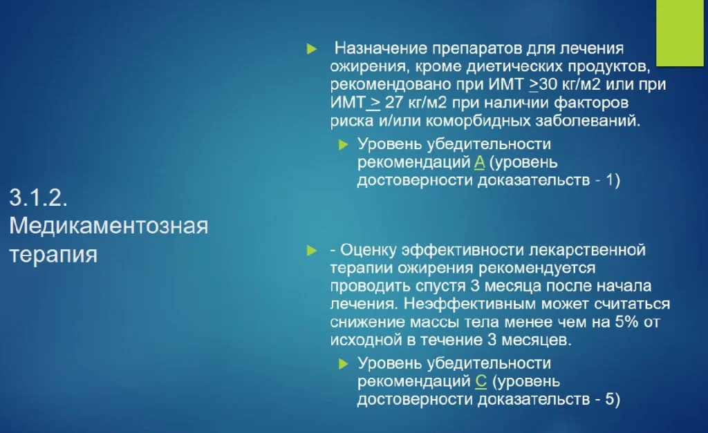 Препараты для лечения ожирения, кроме диетических продуктов, рекомендованы пациентам, которые не могут достичь клинически значимого снижения массы тела.