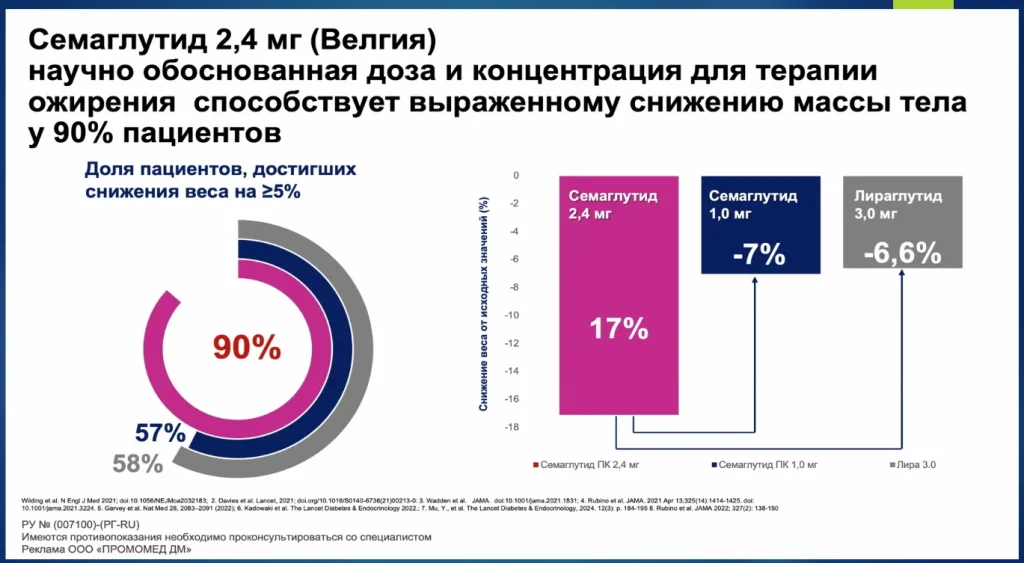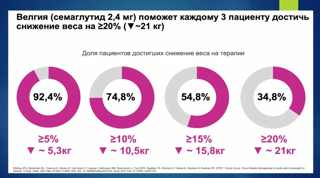 Снижение массы тела 5% в этой категории препаратов — это несерьёзно. Велгия семаглутид может помочь каждому третьему пациенту снизить массу тела больше, чем на 20%.
