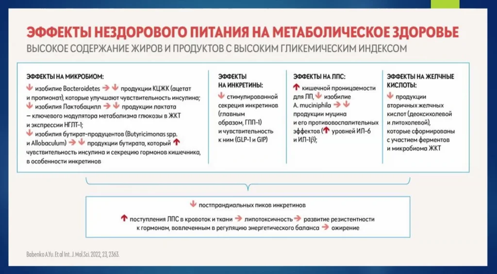 Если говорить о желудочно-кишечном тракте, то все эти эффекты нездорового питания приводят к тому, вскрывается липотоксичность, которая скрыта, развивается резистентность к инсулину, нарушается энергетический баланс и прогрессирует ожирение.