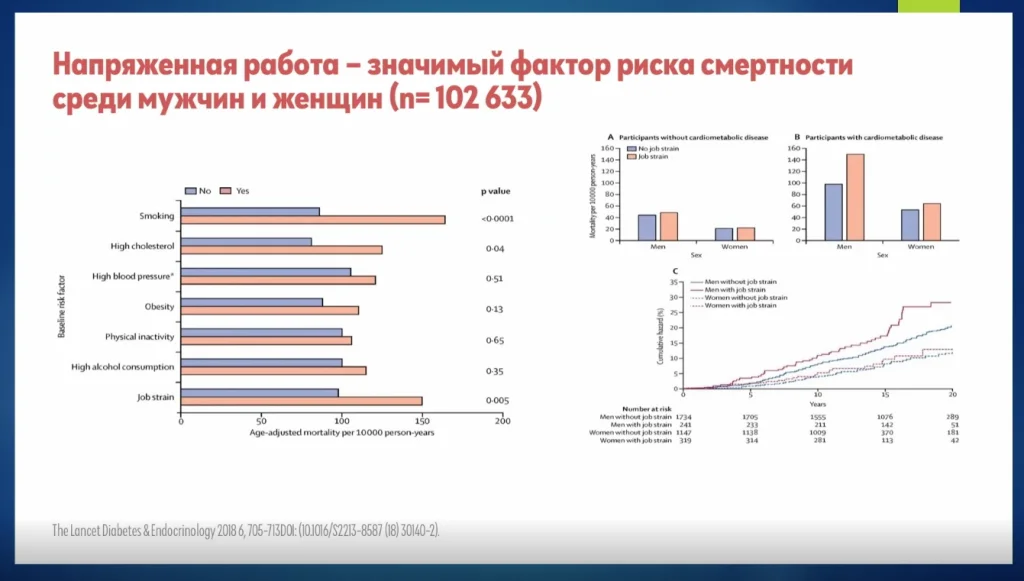 На рисунке ниже представлено, то напряженная работа среди всех значимых факторов риска смертности гораздо больший фактор риска, чем-то, что могут поменять врачи.
