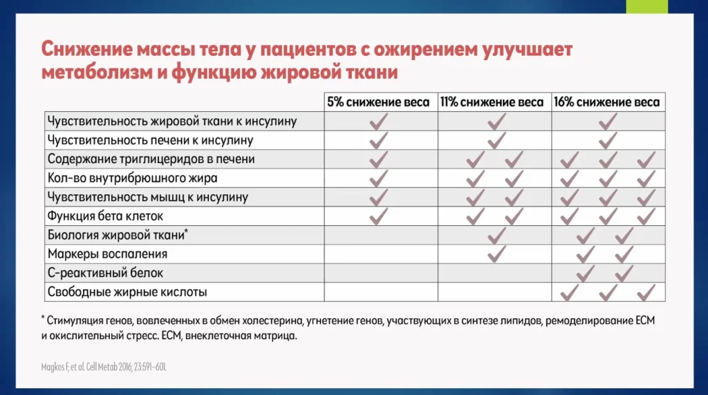Снижение массы тела у пациентов с ожирением улучшает метаболизм функций жировой ткани. Пациентам нужно уменьшить массу тела как минимум больше, чем на 15%, тогда можно предупредить взращивание этих “ростков”.