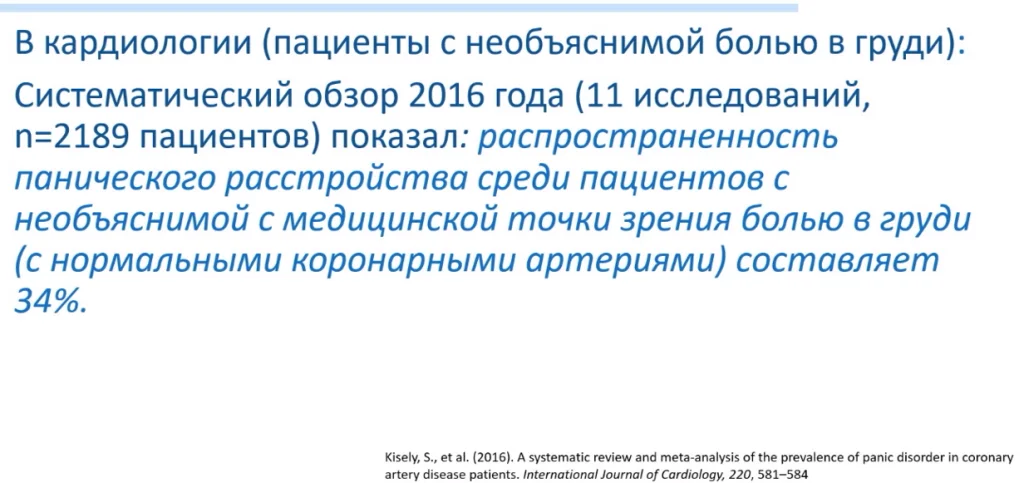 В кардиологии пациенты обычно с необъяснимой болью в груди, когда уже прошли множество различных обследований, систематический обзор 2016 года, показал распространенность панического расстройства среди пациентов с необъяснимой с медицинской точки зрения болью в груди, с нормальными коронарными артериями. Это количество пациентов составляет 34%.
