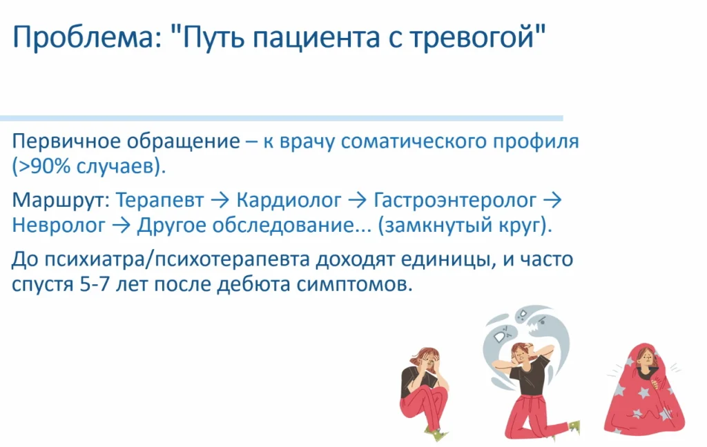 Здесь врач сталкивается с ключевой проблемой — путь пациента с тревогой, потому что в большинстве случаев пациент с необъяснимыми симптомами в теле обращается сначала к терапевту, говорит: «У меня болит сердце, мне нужен кардиолог». Терапевт направляет к кардиологу, гастроэнтерологу, дерматологу, к неврологу. И формируется порочный круг - пациент многие годы не доходит до специалиста, который занимается ментальным здоровьем, будь то психиатр, психотерапевт.