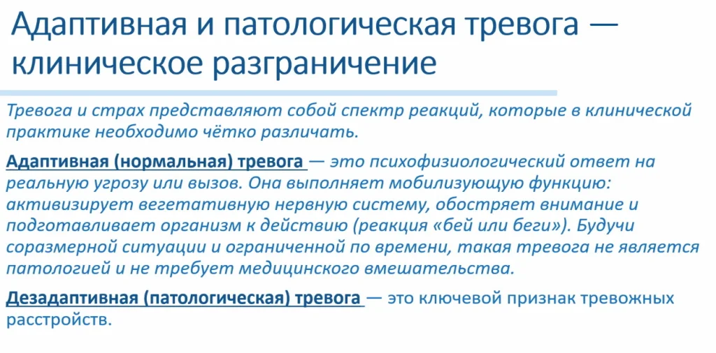 Адаптивная, нормальная тревога — это психофизиологический ответ на реальную угрозу или вызов. Она выполняет мобилизующую функцию, активирует вегетативную нервную систему, обостряет внимание и подготавливает организм к действию. Это называется реакция «бей или беги». Она соразмерна ситуации и ограничена во времени, не является патологией и не требует медицинского вмешательства.